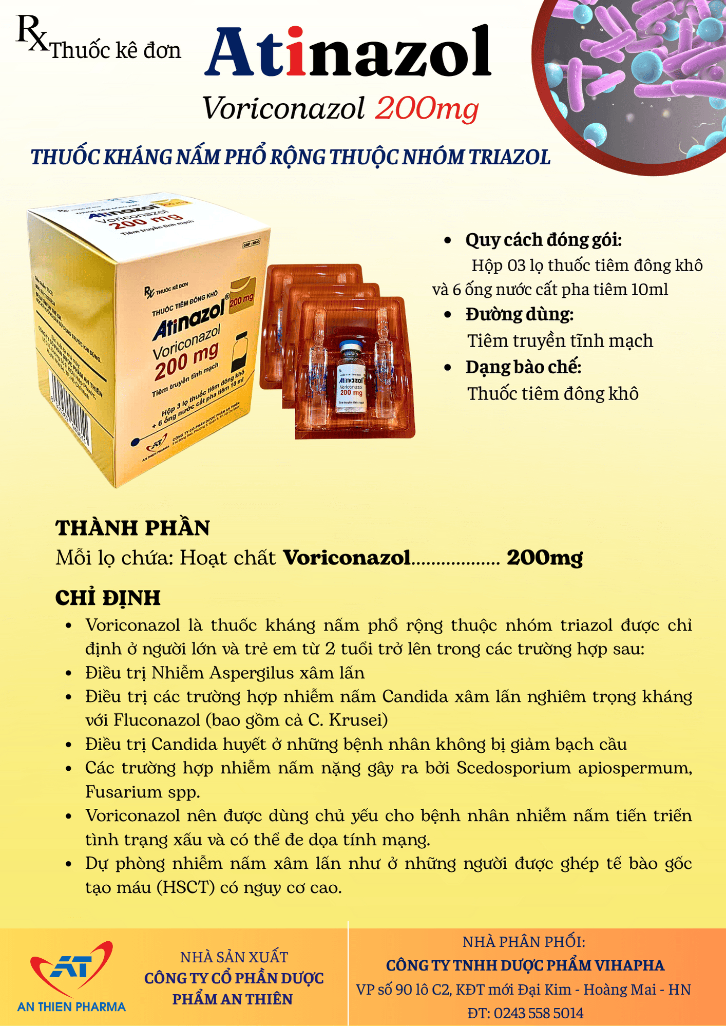 Atinazol - Voriconazol 200 Thuốc tiêm kháng nấm phổ rộng hiện đang được bán sỉ lẻ tại Công ty TNHH Dược Phẩm Vihapha. Các bạn vui lòng liên hệ hotline công ty Call/Zalo: 0919 654 189/ 1800 585 865 để được giải đáp thắc mắc về giá.