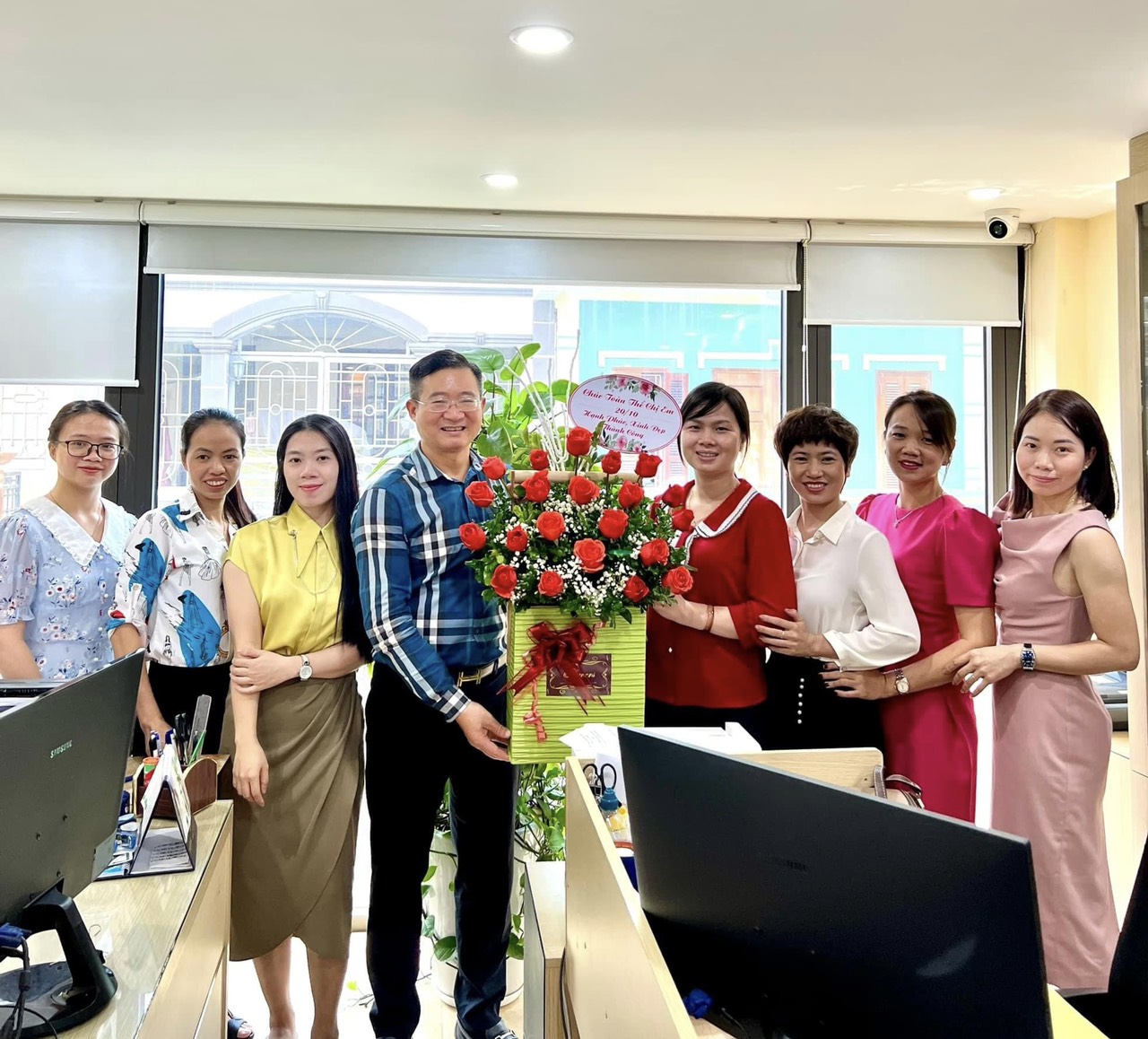 Ảnh: Đại diện Ông Nguyễn Văn Thành trao tặng lẵng hoa tươi thắm cho chị em CBCNV