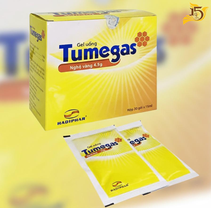 Tumegas được bào chế dưới dạng gel uống / hỗn dịch uống (gói 15 ml). Hàm lượng phổ biến: mỗi gói 15 ml chứa 4,5 g bột nghệ vàng (cùng các tá dược như mật ong, natri benzoat)