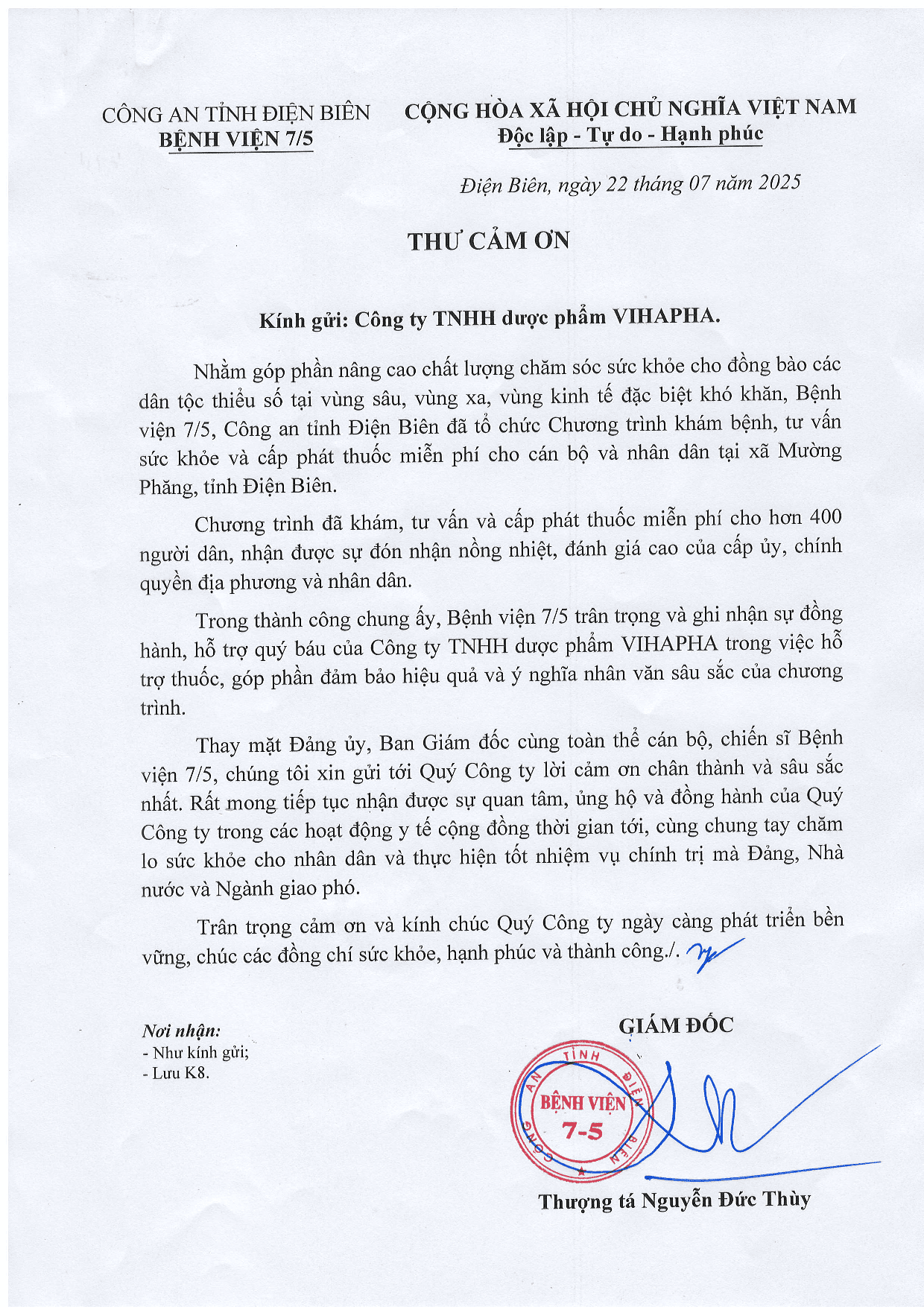 Ngay sau chương trình, Công ty TNHH Dược phẩm Vihapha đã nhận được Thư cảm ơn trang trọng từ Ban Giám đốc Bệnh viện 7/5 – Công an tỉnh Điện Biên. Trong thư, bệnh viện bày tỏ sự trân trọng và ghi nhận sâu sắc đối với sự hỗ trợ quý báu của Vihapha, đồng thời mong muốn tiếp tục được đồng hành trong các hoạt động thiện nguyện y tế trong thời gian tới.