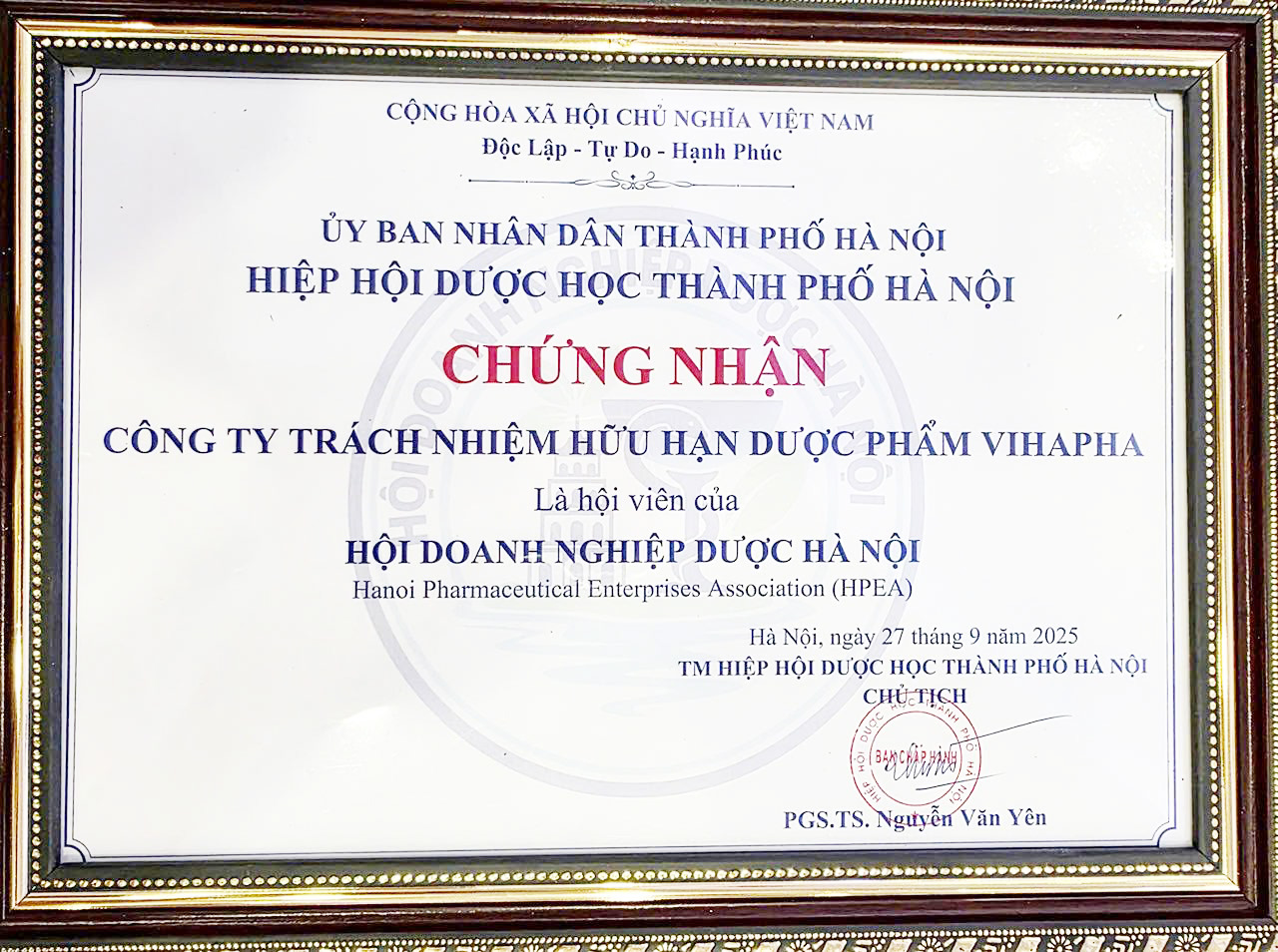 Ảnh: Giấy chứng nhận Công ty TNHH Dược Phẩm Vihapha là hội viên của Hội Doanh nghiệp Dược Hà Nội