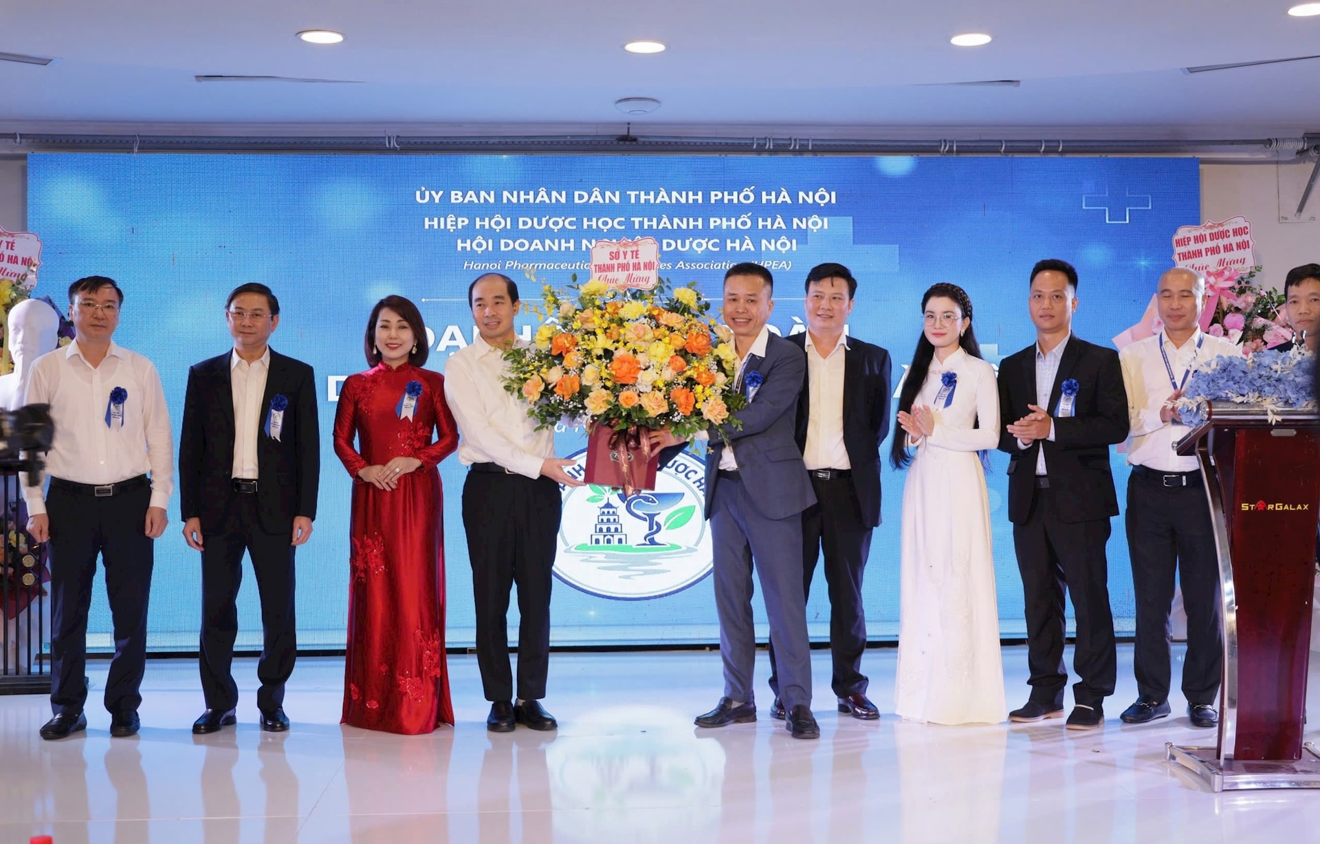 Ảnh: TS. Nguyễn Đình Hưng tặng hoa chúc mừng Ban chấp hành Hội Doanh nghiệp Dược Hà Nội